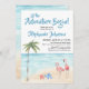 Beach Ocean Surfa Äventyr Baby Shower Det är en pojkinbjudan. Vattenfärgsstrandscen med "Låt Äventyr börja", babyduschdesign. Perfekt för mamma att bli kärlek, stranden, hav och äventyr och att inte vänta på att ta sig an deras underbarare äventyr, med baby! Utformningen är en blå temafärg med söt sand, strand, havets surfa, flamingos, handflatan träd och flinflip flops.