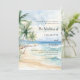 An elegant wedding invitation for a beach wedding, destination wedding. A watercolored sandy beach, ocean waves and palm trees as background.
