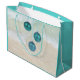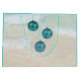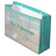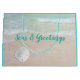 Stor julklapp med strandbakgrund på båda sidor. Anpassa ordalydelsen på framsidan - exempeltexten är "Seas och Hälsning" med vit sand på stranden och utformning. Baksidan av påsen har också en tropisk strandbild med tre blå träd-dekorationer hängande uppifrån.