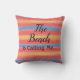 Beach kallar mig för svart text på framsidan med pastellkorall rosa, himlar blå, gult och vit vattenfärg rand med rosa bakgrund. Perfekt för alla som kärlek strand- och strandhusdekoration. Baksidan har heltäckande utskrift med himlar blå färg. Ursprunglig design av TamiraZDesign.