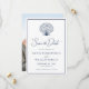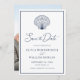 Det här enkla minsta marinblått och vita bröllop spara datum-kortet har en snäcka i det övre, elegant-skriptkalligrafi och ett ram runt kant, med en fotomall på baksidan.