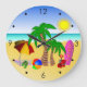Vid Perfekt © Sunny Mars Design. Den här söta, färgstarka coolan med stor rund strandväggskur visar en roligt med en strandscen med strandartiklar, t.ex. ett strandparaply, en strand boll, flinflip flops, en hink och spade, handflatan träd, en strandduk och en surfboard. Gör en perfekt till älskare på stranden.