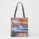 Målning av en strand vid gryningen med små vinkara och fiskmåsar som flyger i den färgstarka rosan och orange himlar.