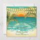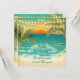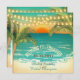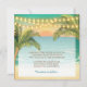 Handflatan träd och stränger ljus ram vid havsolnedgången och sandstranden på den vackra bröllopsinbjudan till stranden. Anpassa den moderna snyggten på framsidan och baksidan med bröllop-informationen.