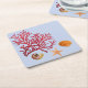 Blått pappert underlägg för att matcha tallrikar och blöjor för ditt strandtemaparty. Dekorerad med rödkorall och silar från fläkt.