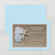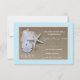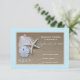 Den här vackra bröllopsinbjudan för OSA på stranden innehåller ett foto av ett årstidsskal, sanddollar och stjärnfisk på brunt. Blocket är omgivet av en vit, persikofärgad och större strandblå gräns. Du kan anpassa det datum du vill få ditt svar på den här OSA bröllopsinbjudan i matchande strandblått. En vacker inbjudan till OSA bröllop. Copyright henishouseofpaper