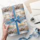 A beautifully decorated wedding arch stands on a sandy beach, framed by rows of chairs adorned with white tulle fabric and flowers