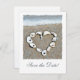 Ett hjärta som består av sjöhäckar som finns på stranden framför havets tidvatten som rullar in på sanden gör ett underbart vykort spara-till-datum för att skicka ut för bröllop, årsdag eller andra särskilda tillställningar. Anpassa den till din speciella dag. Matchning av frimärke för bröllopsaffisch finns också.