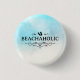 Knappen har watercolor strand vatten sand och ordet "beachaholic" med dekorativ accent och flipflops.