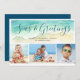 Skicka varma årshälsningar med det strandtemade julkortet. Kustfotokortet har en vattenfärgad våg i havets grönt på en sandstrand. Söt-skript visar "Seas & Hälsning" i kalligrafbokstäver av blå grönt. Tre foton finns under den målade vågen. Om du vill anpassa dig lägger du till namnen och tre favoritfoton.
