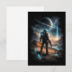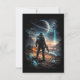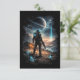 A lone explorer stands on an alien landscape beneath a ringed planet and a mysterious cosmic signal piercing the night sky.