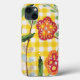 Blomformad med sömnad och pärlor på vit och gult gingham mönster.