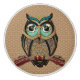 En vacker Art Deco uggla på en mjölkaktig kaffekantbakgrund. Fågeln är invaderad med guld, turkos, svart och silver och sitter på ett broderat gren. Det stiliserade motivet är typiskt för 1930-talet.
