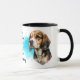 En vattenfärg porträtt av en vacker Beagle Hound-Hund är utmärkande på två sidor av mugg. Varje bild placeras på en ljusblå spatterbakgrund. Mellan två bilder finns texten som beskriver denna lojala och kärleksfulla följeslagare, med "BEAGLE-hund" svart i grund. All text är lätt att anpassa till vad du vill, så att du kan beskriva din egen lojala vän.