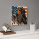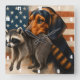Konstnärlig skildring av en Beagle-hund och en paroll på en dekorativ klocka, mot en amerikansk bakgrund, blandande patriotism och djursällskap i en funktionell och konstnärlig hemdekoration.