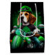 En vän i håriget bakom handlebarna från en grönt som är blankt och som har en grönt Saint patrick's day som gör att huvudena svänger. Hund är klädd i en festlig ensemble, komplett med en grönt och en passande top hat som sitter på sitt fula huvud. De stora skammusslorna och leprechaunsarna är mycket bra utformade, och det skapar tydligt att hund är redot att fira Saint patrick's day i stil.