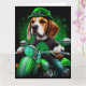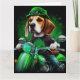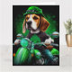 En lurvig vän bakom de blanka handtagen på en skinande grön cykel, iklädd en grön St. Patrick's Day-outfit som får huvuden att vända sig. Hunden är klädd i en festlig ensemble, komplett med en grön fluga och en matchande toppmössa som sitter prydligt på huvudet. Outfiten har invecklade mönster av shamrockar och lämmelkarlar, vilket gör det tydligt att denna hund är redo att fira St. Patrick's Day med stil.