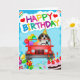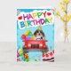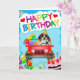 Beagle hund kör med Födelsedagsballonger och tårta är en perfekt Födelsedagskort för någon som älskar dachshund hundar. Varje Beagle mamma eller pappa kommer att älska detta.