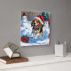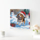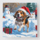 En hjärtvärmande julillustration med en glad hund som leker i snön, bärande en tomtehatt och omgiven av färgglada presentlådor. I bakgrunden bygger barn en snöman bredvid ett snötäckt julgran, vilket skapar en glädjefull vintervärld. Perfekt för att sprida julstämning och fånga julens magi.
