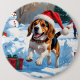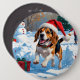 En hjärtvärmande julillustration med en glad hund som leker i snön, bärande en tomtehatt och omgiven av färgglada presentaskar. I bakgrunden bygger barn en snöman bredvid ett snötäckt julgran, vilket skapar en glädjefull vintervärld. Perfekt för att sprida julstämning och fånga julens magi.