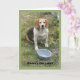 Beagle som tittar upp från sin matskål. kort