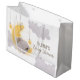 Anpassa den här snygga babyvisaren Stor gift-Nalle med en hand plockade-illustration av en söt brunt baby-nalle som ligger bekvämt i en säng på ett måne täckt med en mjuk filt, omgiven av fina grått-moln medan måne och de två stjärnorna tittar över baby. Den här designen är en mall för enkel anpassning av onlinen.