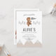 En vattenfärgad björn som håller flagga med nummer "ett" i den, tillsammans med träd och berg runt designen. Perfekt för ditt skogshöns Födelsedagsfest! Du kan ändra "en" i flagga till valfritt nummer och redigera all annan text.