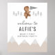 En vattenfärgad björn som håller flagga med nummer "ett" i den, tillsammans med träd och berg runt designen. Perfekt för ditt skogshöns Födelsedagsfest! Du kan ändra "en" i flagga till valfritt nummer och redigera all annan text.