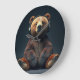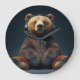 A bear is shown sitting upright while wearing a pair of large headphones. The animal appears calm and content, with a dark background enhancing its fur color.