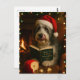Humorous Christmas postcard featuring a Bearded collie dog reading 'The Cheese Tax at Home Regulations 2025' whilst trying to resist the urge to eat the cheese that someone's left on the table right in front of its nose!