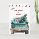 Ett tårblått pickupt lastbil bär ett skärsår i Helgdag träd på framsidan av detta söta julkort. Vid sidan av träd sitter en skygg, böjd kollie-hund med röd och vit Jultomten-hatt. Överst på kortet finns en rad Helgdag och anpassningsbar som för närvarande säger "Från vårt hus till ert". På kortets insida finns mer fält för att du ska kunna anpassa. Ljus, roligt och färgstark!
