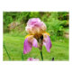 Nära en rosa- och lila-skäggig iris som visar skägret av gult