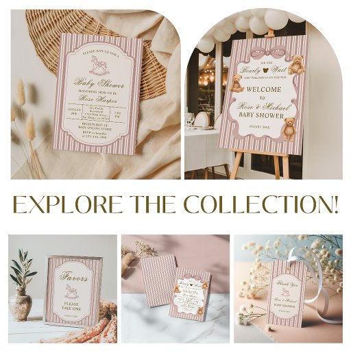 This design came together around the playful “bearly wait” phrase and a love for classic teddy bears. Soft blush stripes, gentle textures, and cozy plush details create a warm, nostalgic feel—perfect for celebrating a little one on the way in the sweetest style.
