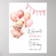 Greet your guests with the ultimate "aww" factor using our "Beary First Birthday" Welcome Poster. This large-format sign features a high-quality watercolor illustration of our signature teddy bear in a pink tutu, floating with a cluster of soft blush and peach balloons.