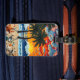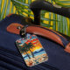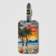Beach art luggage tag. An impasto oil painting style ai illustration of a beach full of palm trees, sea glass, sea shells and ocean waves at sunset. A bright colorful mesh of colors make this coastal art vibrant and beautiful!