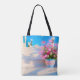 Stunning digital design of flowers on white steps with blue sky image on this tote bag. Perfect gift for birthdays, Christmas Holidays or any other occasion, most people love a practical beautiful tote bag for shopping, school, beach or other occasions. Design by Inge Lewis. Find more matching products at the ingeinc.com online store / boutique.
