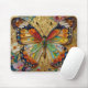 A pretty mouse pad with a front illustration of a beautiful gold, teal and orange butterfly surrounded by yellow, white and purple flowers. It's done with an impasto style and just emanates beauty and grace.
