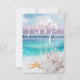 Rosa och lavandesoluppgång himlar med puffa moln, soluppgången börjar precis reflektera över havet vinkart. Söt koral, öppna ostron med pärlor inuti den här inbjudningsdesignen. Inställning av tropisk kuststrand för den perfektens bröllop eller destinationsö bröllop.