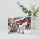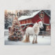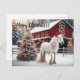 Beautiful white horse wearing a santa sat with a lighted Christmas tree and a rustic red barn Postcard