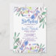blommigten födelsedagsfest inbjudan för vattenfärg i snyggt för att du ska kunna anpassa/anpassa. Mjuka blåsor, lila och gröntar dominerar över en vit bakgrund. Du ändrar texten "Gå med oss" till ett speciellt födelseår om du föredrar det.