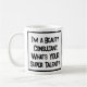 Lustigt slogan på en mugg som säger: "Jag är en skönhetskonsult. Vad är din toppen?" Mugg för en skönhetskonsult. Svart och vit fet text.