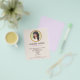 Snygg illustration av brunettmuse med lila, rosa och blommigtens krans. En perfekt med elegant för hårsalon och skönhetsvård som erbjuder i ekologiska professioneller, mode eller skinkare, samt möhippa konsulter. Ljus rosa bakgrund.