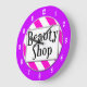 En unik väggklocka som läser Beauty Shop i retro brev med rosa och vit strimlad bakgrund omgiven av vita tal på lilan. Klicka på Anpassa om du vill ändra färg för bakgrundsinformation med mera.