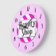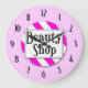 En unik väggklocka som läser Beauty Shop i retro brev på en rosa och vit strimlad bakgrund omgiven av svarta siffror på rosan. Klicka på Anpassa om du vill ändra färg för bakgrundsinformation med mera.