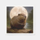 A beaver sits on a log by the river, illuminated by a full moon glowing brightly behind it, with lush foliage surrounding the scene