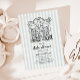 Cute whimsical hand plockade Cafe Bebe-Fransken inspirerade inbjudan till babydusch med en mjuk, blå, strimlad bakgrund och en hand plockade-illustration av ett kafé i Paris.