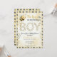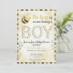 Den här söta baby shower inbjudan visar ett akvarell-tvättat buffalo-rutigt mönster i svart och gult för samma färgpalett som en humla. Ett lekfullt talesätt "bruset är att vi får en pojke".