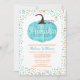 Modern liten pumpa in inbjudningar till babyduschen för pojke. Chic blå vattenfärgspumpa och konetti i höstens orange och blått. Fira att ett fall kommer till pojke!