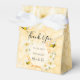 En favoritbox för en sommarbabyåkare, könsneutral. Gultens bakgrund med en bikaka mönster. Med faux guld geometric ram. Dekoreras med lätt gult, grädda färgad tropiska blommigtar blommor, hibiscus och lycklig som leker humla. Med texten: Tack och Mamma till Bee skrivet med ett modernt handskript i stil. Anpassa och lägg namn i mamma till biets namn och duschdatum. Black brev.