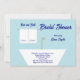 Den blå sängen och badet inbjudningskort för möhippan har pulverblått och marinblått. Två vita handdukar och en vit badbalja finns också med. Namn i bruden och brudgummen visas på handdukarna och duschdetaljer visas i badkaret. Ett unikt inbjudan till en säng- och badbåt-möhippa.
